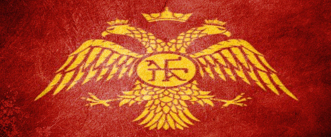 The double-headed eagle with the sympilema (dynastic cypher) of the Palaeologi in the center. The double-headed eagle motif was used as the emblem of the Eastern Roman Empire (Byzantine Empire) during the 14th and 15th centuries, when ruled by the Palaiologos Dynasty
